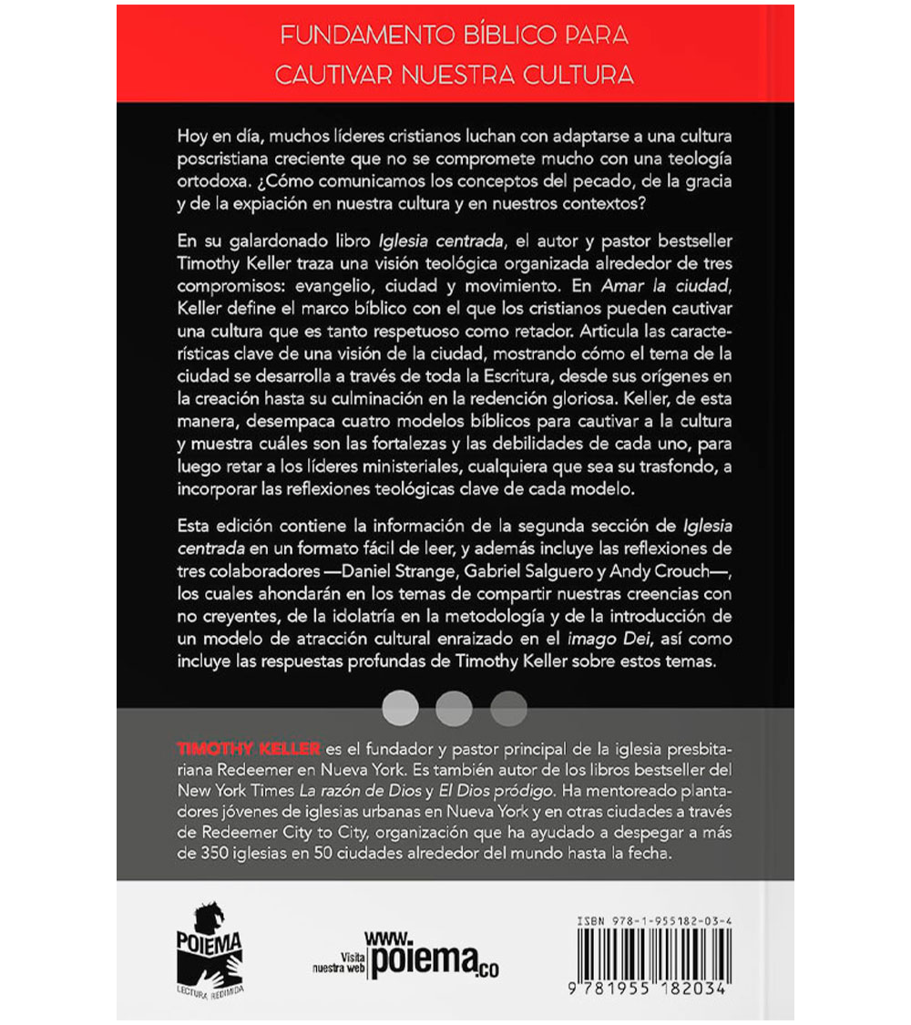 En su galardonado libro Iglesia centrada, el autor y pastor bestseller Timothy Keller traza una visión teológica organizada alrededor de tres compromisos: evangelio, ciudad y movimiento. En Amar la ciudad, Keller presenta un marco bíblico con el cual los cristianos pueden interactuar con la cultura de manera respetuosa y a la vez desafiante. Articula las características clave de una visión de la ciudad, mostrando cómo el tema de la ciudad se desarrolla a través de toda la Escritura, desde sus orígenes en la creación hasta su culminación en la redención gloriosa. Keller desempaca cuatro modelos bíblicos para interactuar con la cultura y muestra cuáles son las fortalezas y las debilidades de cada uno, para luego retar a los líderes ministeriales, cualquiera que sea su trasfondo, a incorporar las reflexiones teológicas clave de cada modelo.