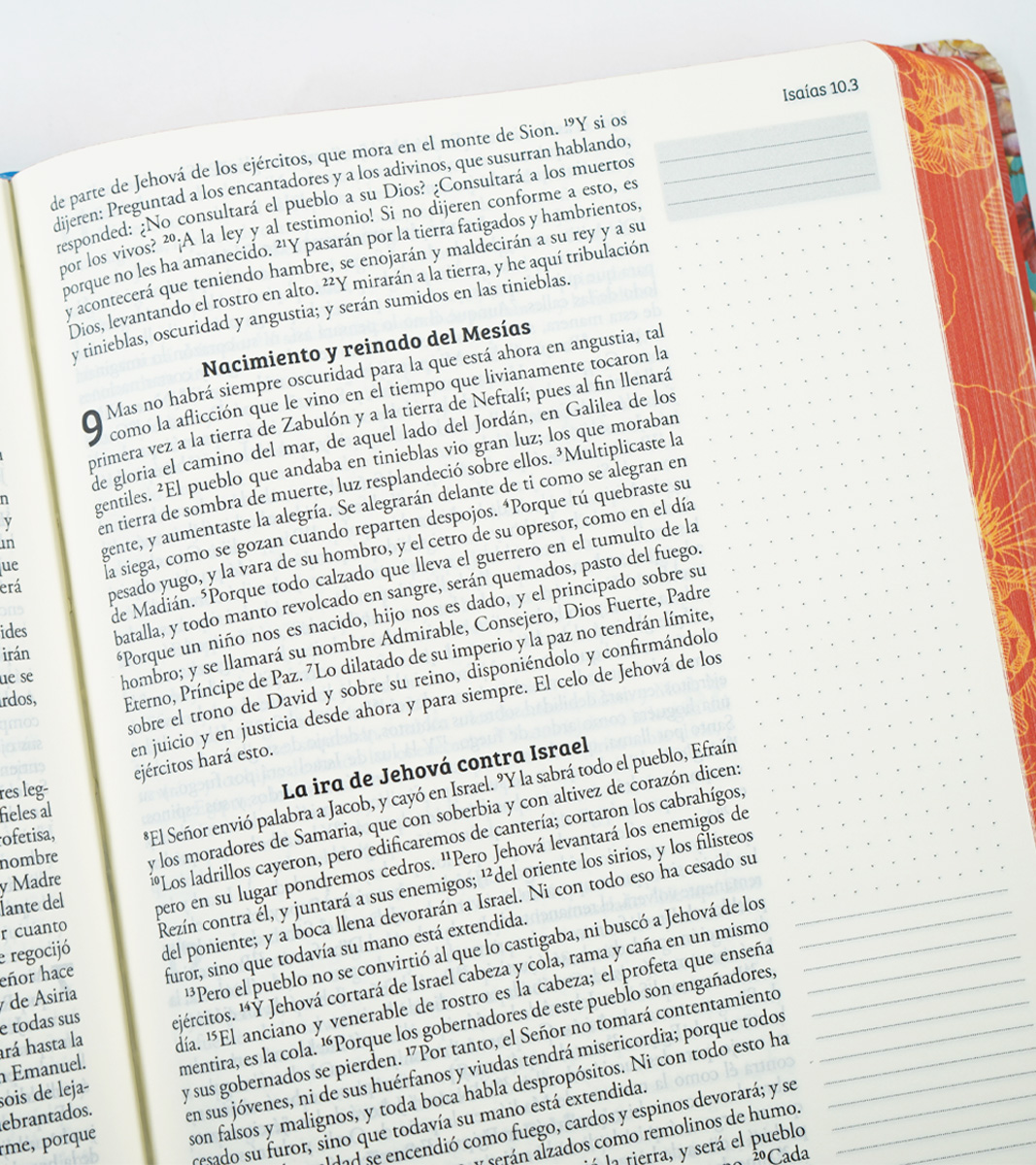- Espacios Amplios para Notas: Con márgenes generosos, tendrás el espacio ideal para escribir, ilustrar y anotar tus versículos favoritos. Organiza tus ideas de manera única, ya sea a través de palabras, dibujos o símbolos.