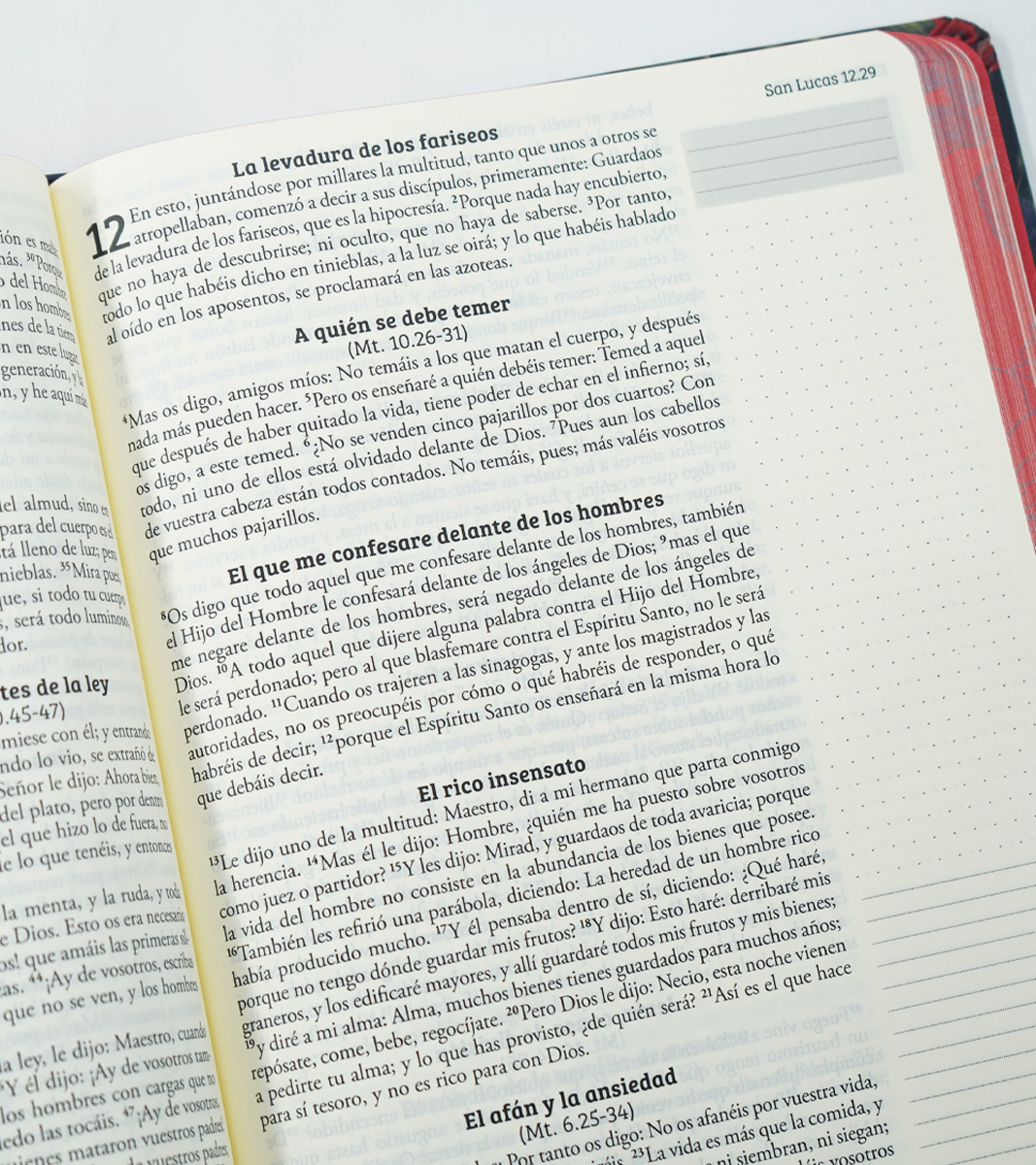- Espacios Amplios para Notas: Con márgenes generosos, tendrás el espacio ideal para escribir, ilustrar y anotar tus versículos favoritos. Organiza tus ideas de manera única, ya sea a través de palabras, dibujos o símbolos.