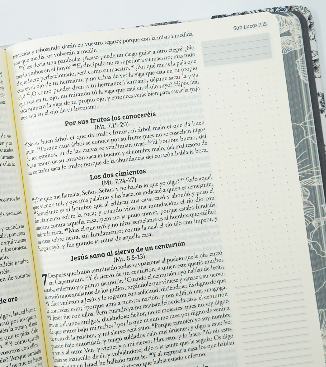- Espacios Amplios para Notas: Con márgenes generosos, tendrás el espacio ideal para escribir, ilustrar y anotar tus versículos favoritos. Organiza tus ideas de manera única, ya sea a través de palabras, dibujos o símbolos.