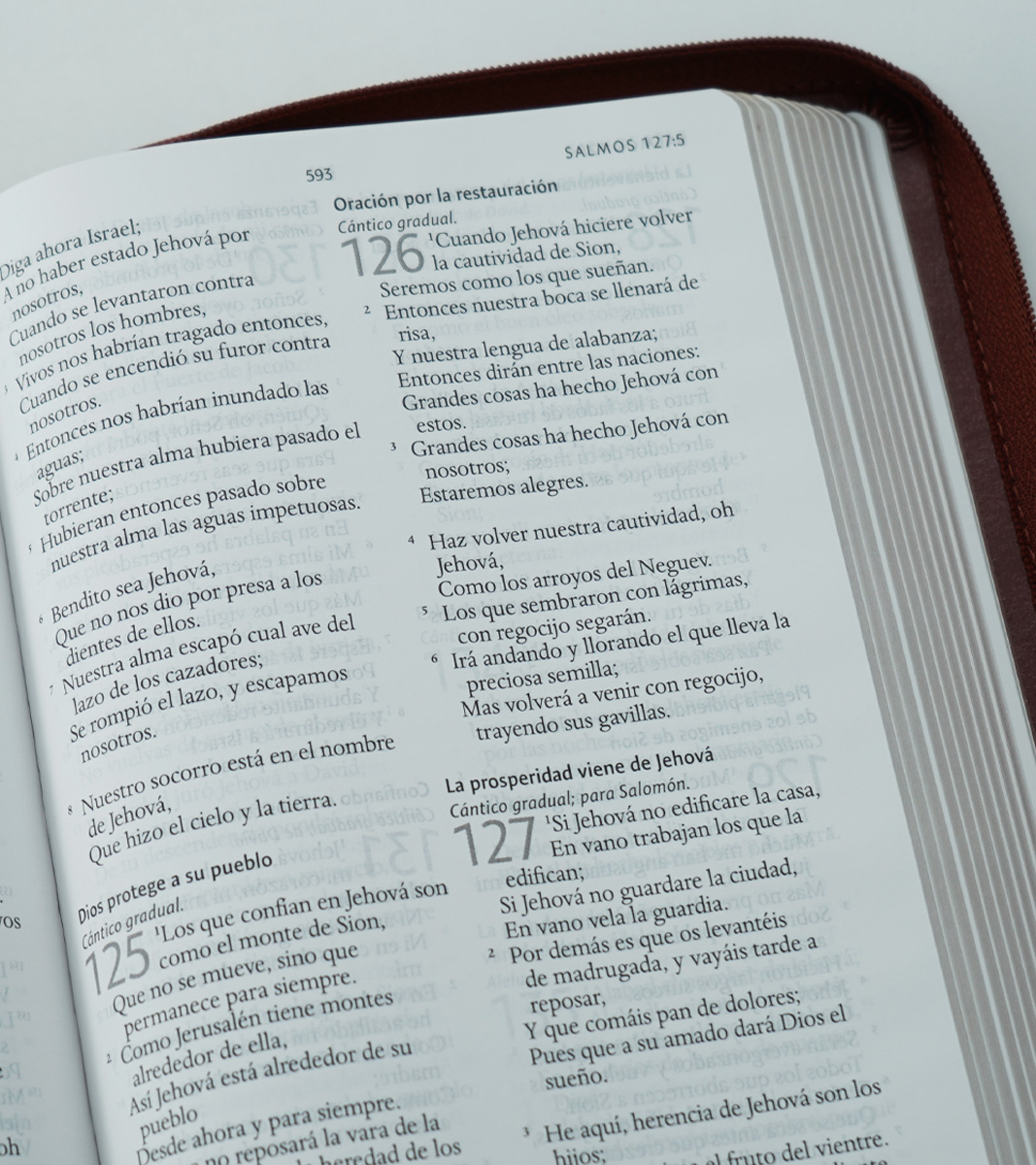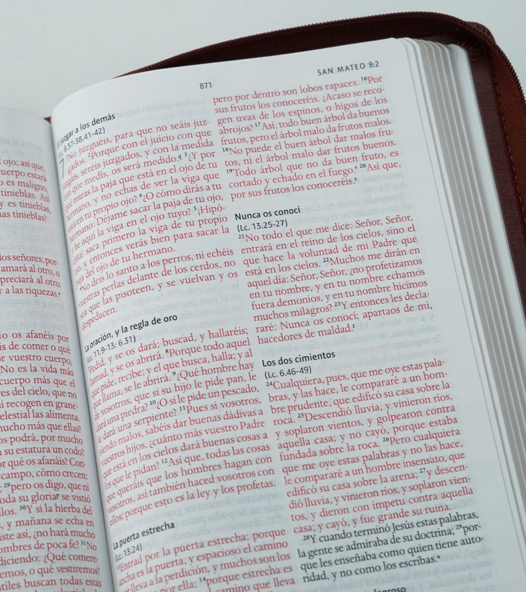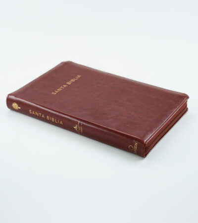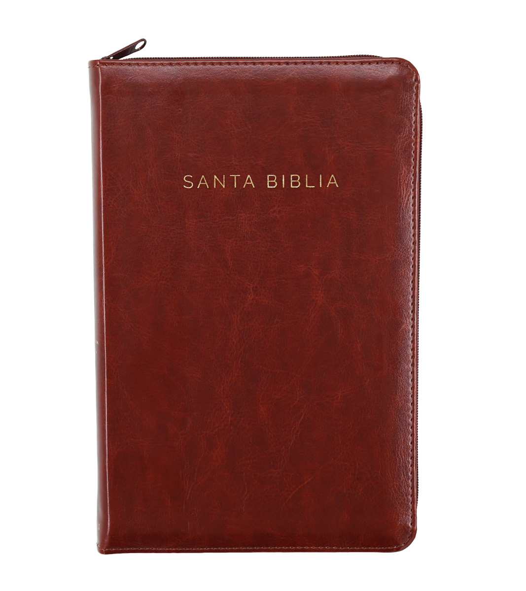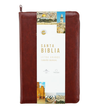 Biblia tamaño manual con letra grande. Símil piel color marrón, con cierre y estampado dorado en la cubierta. Incluye borde dorado, cinta marcadora y fotos a color de Tierra Santa.