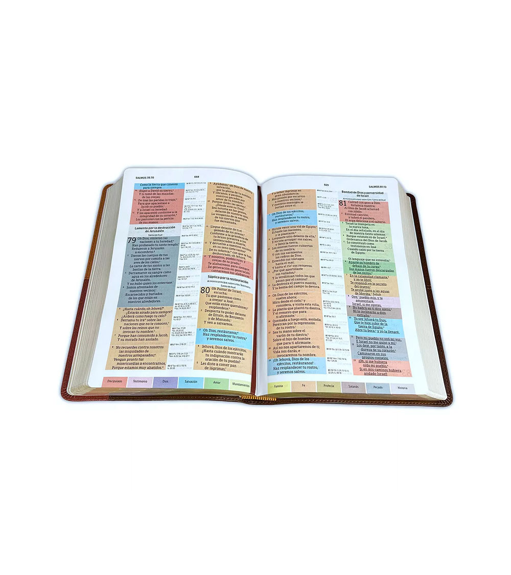 - Cada versículo en su propio color de acuerdo con 12 temas clave