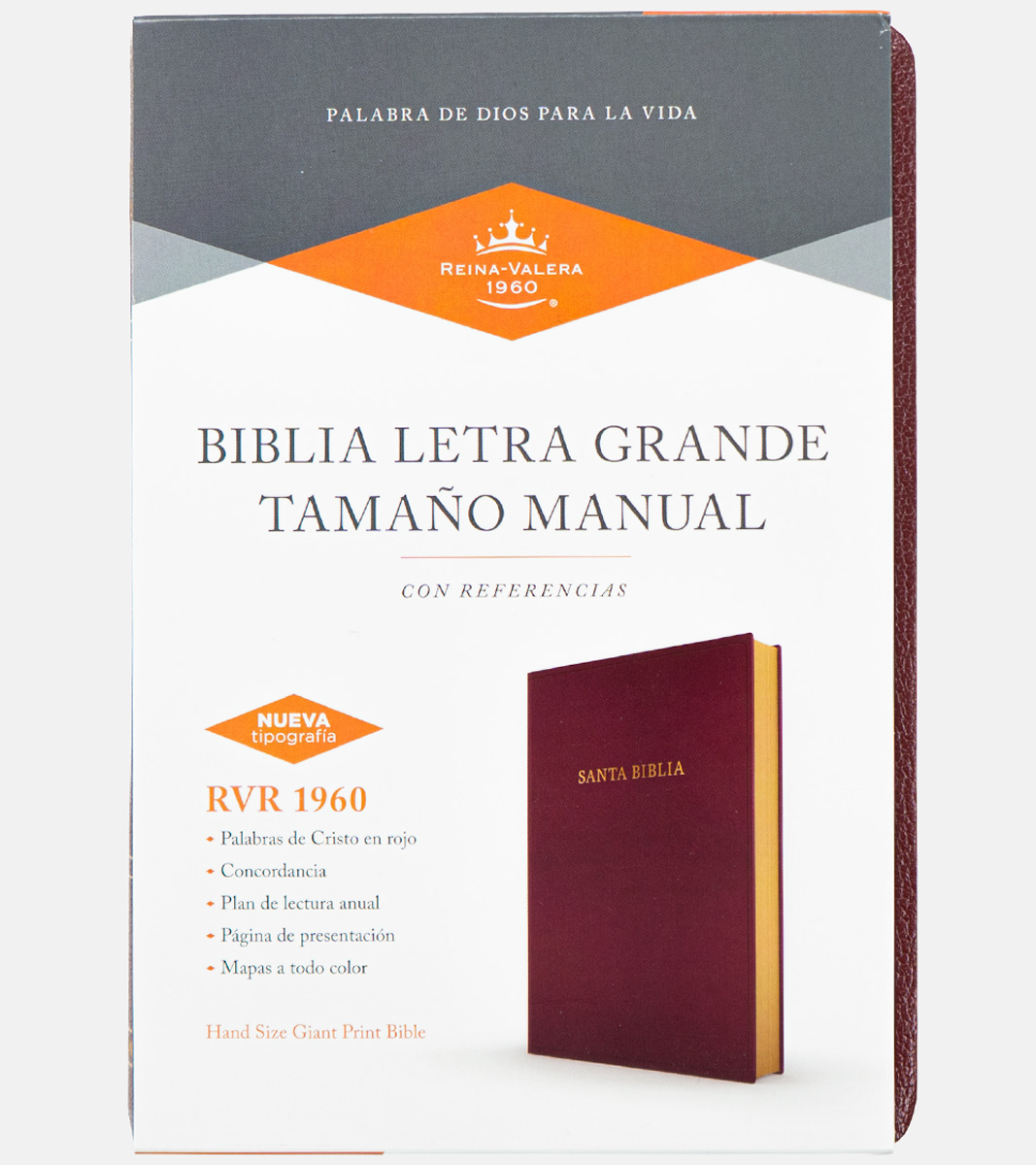 Biblia tamaño manual, con referencias en cadena, palabras de Cristo en rojo, plan de lectura, atributos de Jesús, cinta marcadora y mapas a todo color.