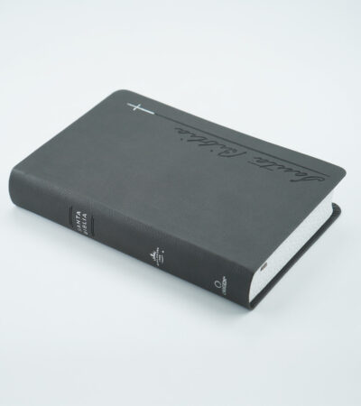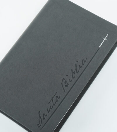Biblia tamaño manual, ultrafina y con letra gigante de 14 puntos. Piel gris, cinta marcadora y fotos a color de Tierra Santa.