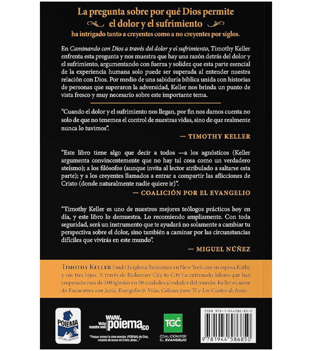 En Caminando con Dios a través del dolor y el sufrimiento, Timothy Keller enfrenta esta pregunta y nos muestra que hay una razón detrás del dolor y el sufrimiento, argumentando con fuerza y solidez que esta parte esencial de la experiencia humana solo puede ser superada al entender nuestra relación con Dios. Por medio de una sabiduría bíblica unida con historias de personas que superaron la adversidad, Keller nos brinda un punto de vista fresco y muy necesario sobre este importante tema.
