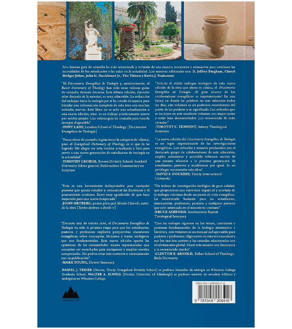 De fácil lectura y fiable, esta obra presenta nuevos artículos sobre temas de relevancia contemporánea para el cristianismo mundial y artículos renovados sobre temas teológicos perdurables, proporcionando una cobertura completa de la A a la Z para los estudiantes de teología de hoy. La base de autores refleja la creciente diversidad de eruditos evangélicos. Entre los editores asesores figuran D. Jeffrey Bingham, Cheryl Bridges Johns, John G. Stackhouse Jr., Tite Tiénou y Kevin J. Vanhoozer.