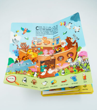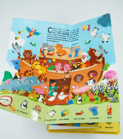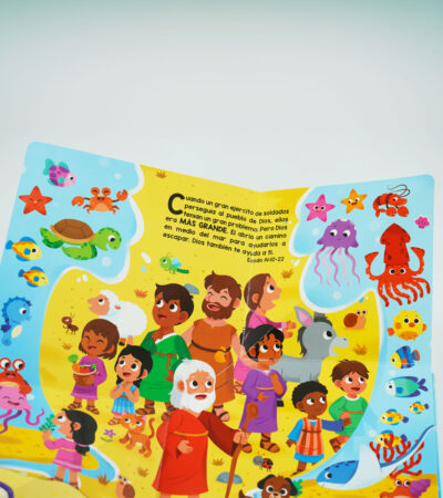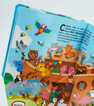 Esta colorida Biblia de “buscar y encontrar” viene con un giro sorprendente: el libro se vuelve casi cuatro veces más grande cuando se abre. Eso también hace que las escenas bíblicas sean grandes y todo se magnifica.