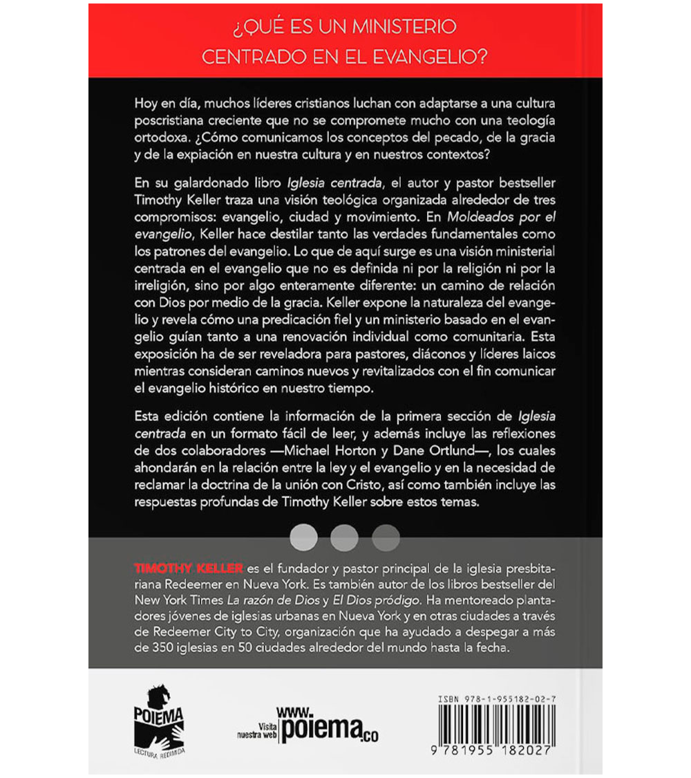 En su galardonado libro Iglesia centrada, el autor y pastor bestseller Timothy Keller traza una visión teológica organizada alrededor de tres compromisos: evangelio, ciudad y movimiento. En Moldeados por el evangelio, Keller hace destilar tanto las verdades fundamentales como los patrones del evangelio. Lo que de aquí surge es una visión ministerial centrada en el evangelio que no es definida ni por la religión ni por la irreligión, sino por algo enteramente diferente: un camino de relación con Dios por medio de la gracia. Keller expone la naturaleza del evangelio y revela cómo una predicación fiel y un ministerio basado en el evangelio guían tanto a una renovación individual como comunitaria. Esta exposición ha de ser reveladora para pastores, diáconos y líderes laicos mientras consideran caminos nuevos y revitalizados con el fin de comunicar el evangelio histórico en nuestro tiempo.