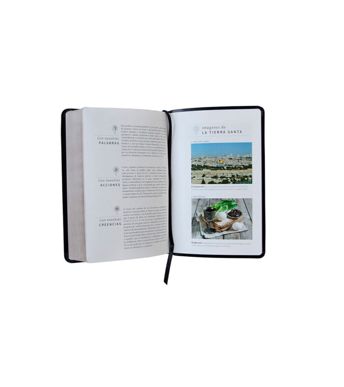 Esta Biblia es perfecta para uso personal o como regalo, gracias a su elegante encuadernación en símil piel negro, página de dedicatoria y cinta marcadora. Con canto dorado, letra grande y las palabras de Cristo resaltadas en rojo, esta edición captura la esencia de Tierra Santa con hermosas imágenes a todo color que invitan a orar por el pueblo de Israel.